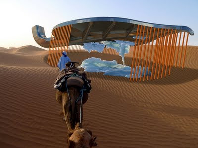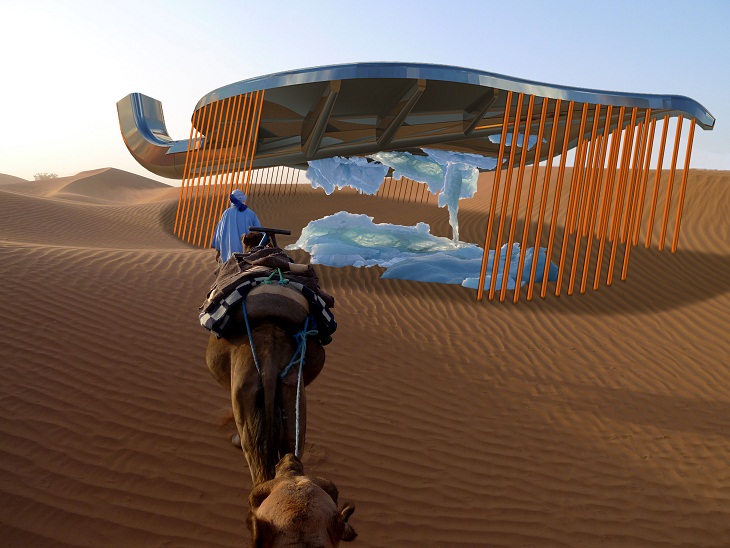 The sun shines on the solarpanels. The produced energy will transfer moisture into ice. The ice will melt and drop down. Of course the sculpture will make in this way also water. World’s first concept of making ice/water out of solar?